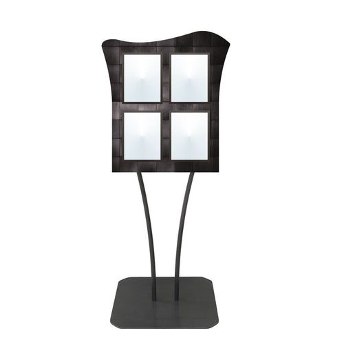 Menu Board, 4-pocket, floor stand, 23" x 23" x 68-1/2"H overall, single-sided, holds (4) 8-1/2" x 11"H inserts, double wave, V-stem stand, clear acrylic covers with magnetic trim closure, metal, cubist chef/black tile design