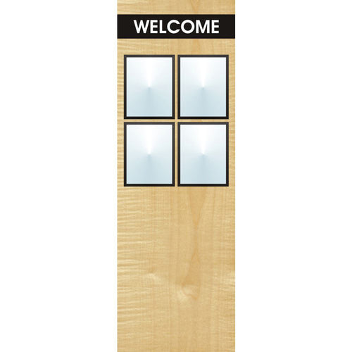 Menu Board, 4-pocket, floor stand, with "Welcome" greeting, 23" x 11" x 66"H overall, single-sided, holds (4) 8-1/2" x 11"H inserts, rectangular, convex, clear acrylic covers with magnetic trim closure, powder-coated steel, white imprinted, maple finish