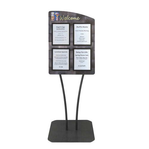 Menu Board, 4-pocket, floor stand, with "Welcome" greeting, 23-3/4" x 23" x 66"H overall, single-sided, holds (4) 8-1/2" x 11"H inserts, side curve, V-stem stand, clear acrylic covers with magnetic trim closure, metal, cubist chef/black tile design