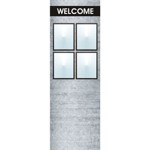 Menu Board, 8-pocket, floor stand, with "Welcome" greeting, 23" x 11" x 66"H overall, double-sided, holds (8) 8-1/2" x 11"H inserts (4 each on both sides), rectangular, convex, clear acrylic covers with magnetic trim closure, powder-coated steel/Sintra® plastic, white imprinted, galvanized finish