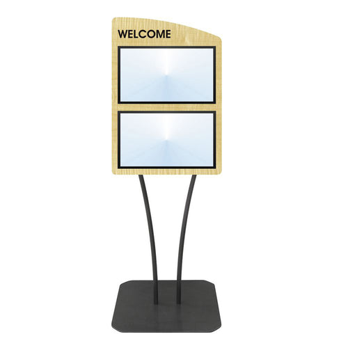 Menu Board, 2-pocket, floor stand, with "Welcome" greeting, 23-3/4" x 23" x 66"H overall, single-sided, holds (2) 17" x 11"H horizontal inserts, curved, V-stem stand, clear acrylic covers with magnetic trim closure, metal, black imprinted, maple wood finish