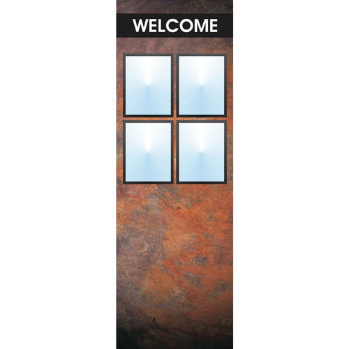 Menu Board, 8-pocket, floor stand, with "Welcome" greeting, 23" x 11" x 66"H overall, double-sided, holds (8) 8-1/2" x 11"H inserts (4 each on both sides), rectangular, convex, clear acrylic covers with magnetic trim closure, powder-coated steel/Sintra® plastic, white imprinted, acid washed finish