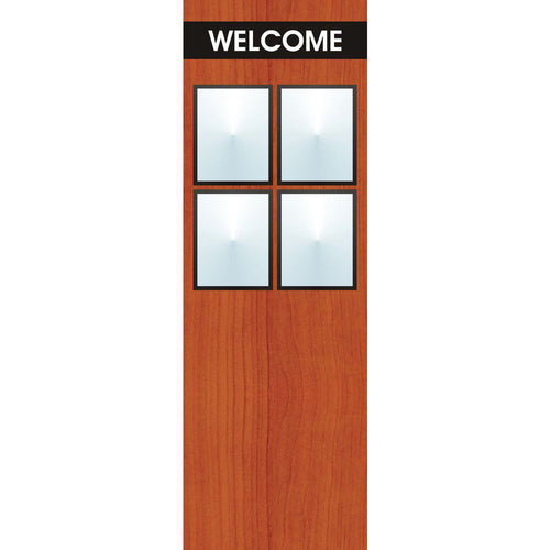 Menu Board, 8-pocket, floor stand, with "Welcome" greeting, 23" x 11" x 66"H overall, double-sided, holds (8) 8-1/2" x 11"H inserts (4 each on both sides), rectangular, convex, clear acrylic covers with magnetic trim closure, powder-coated steel/Sintra® plastic, white imprinted, cherry wood finish