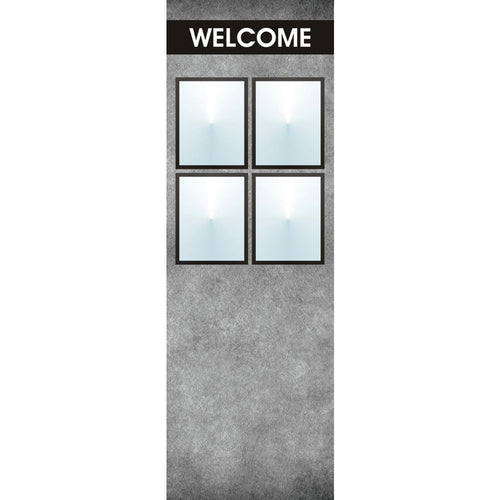 Menu Board, 4-pocket, floor stand, with "Welcome" greeting, 23" x 11" x 66"H overall, single-sided, holds (4) 8-1/2" x 11"H inserts, rectangular, convex, clear acrylic covers with magnetic trim closure, powder-coated steel, white imprinted, grey stone finish