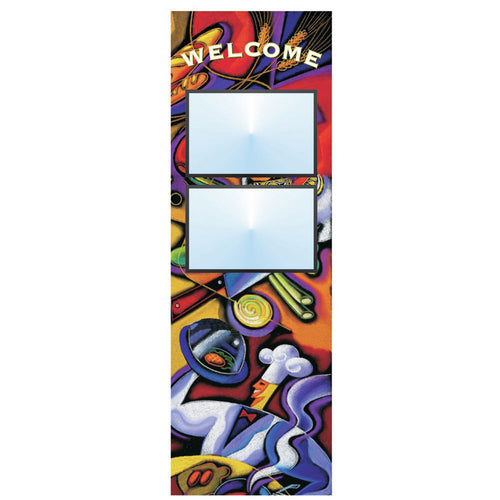 Menu Board, 2-pocket, floor stand, with "Welcome" greeting, 23" x 11" x 66"H overall, single-sided, holds (2) 17" x 11"H horizontal inserts, rectangular, convex, clear laminate covers with magnetic trim closure, powder-coated steel/Sintra® plastic, white imprinted, chalk chef design