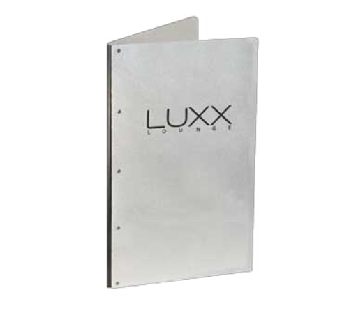 Menu Cover, holds 5-1/2" x 8-1/2" inserts, double panel, aluminum front & back, nickel rivet accents, concealed black spine, includes one-color silk screened logo on front cover, Alumitique (priced per each, minimum order 25)