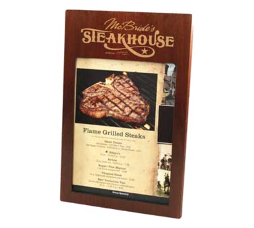 Menu Board, holds 5-1/2" x 8-1/2" insert, single panel, with 2 views, top loading, 1" border, includes logo on both sides, wood frame, Charleston (price per ea, minimum order 25)