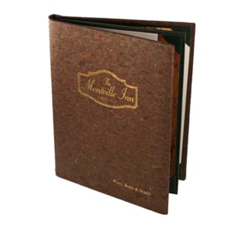 Menu Cover, holds 8-1/2" x 11" insert, single panel with 1 view, rigid construction, turned edge, no stitching, includes logo (up to 45 sq. inches, includes all plate, die, stamp and set-up charges), Cork (priced per each, minimum order 25)