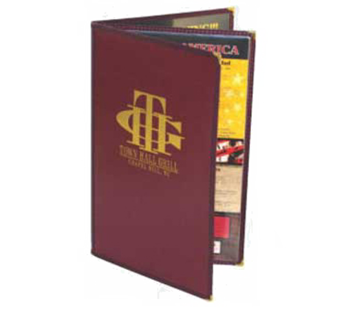Menu Jacket, holds 5-1/2" x 8-1/2" inserts, double panel with 2 views, hot foiled stamped logo on front (up to 45 sq. inches, includes all plate, die, stamp and set-up charges), clear vinyl pockets, hand stitched reinforced vinyl border, metal corners, Chelsea Piers (price per each/min order 25 each)