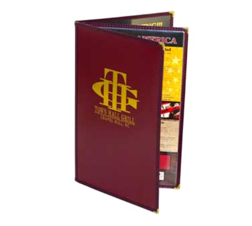 Menu Jacket, holds 8-1/2" x 14" inserts, triple panel booklet with solid back panel, 4 views, hot foiled stamped logo on front (up to 45 sq. inches, includes all plate, die, stamp and set-up charges), clear vinyl pockets, hand stitched reinforced vinyl border, metal corners, Chelsea Piers (price per each/min order 25 each)