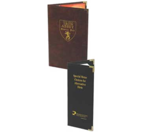 Menu Cover, holds 5-1/2" x 11" inserts, double panel with 2 views, leather-like material wrapped around rigid board, turned and stitched edge, interior picture corner, metal corners, debossed logo on front cover (up to 45 sq. in), Edmonton (price per ea, minimum order 25)