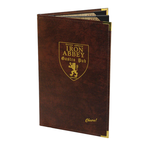 Menu Cover, holds 8-1/2" x 14" inserts, triple booklet with 4 views, leather-like material wrapped around rigid board, turned and stitched edge, interior picture corner, metal corners, debossed logo on front cover (up to 45 sq. in), Edmonton (price per each, minimum order 25)