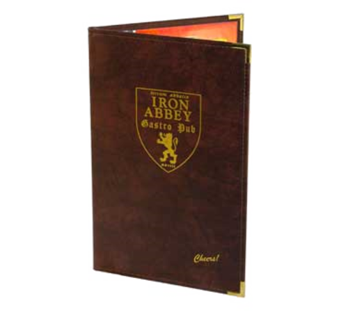 Menu Cover, holds 5-1/2" x 8-1/2" inserts, double panel, leather-like material wrapped around rigid board, turned and stitched edge, clear pockets sewn in front & back inside lining, metal corners, includes logo on front cover (up to 45 sq. inches, includes all plate, stamp, deboss, and set-up charges), Essex (price per ea, minimum order 25)
