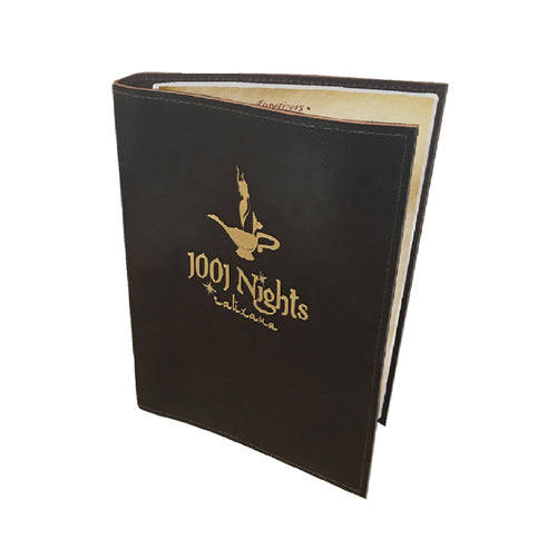 Menu Cover, holds 5-1/2" x 8-1/2" inserts, single panel with 1 view, flush cut stitched edge, genuine leather, with hot foil stamped/debossed logo on front cover (includes all plate, stamp and set-up charges)