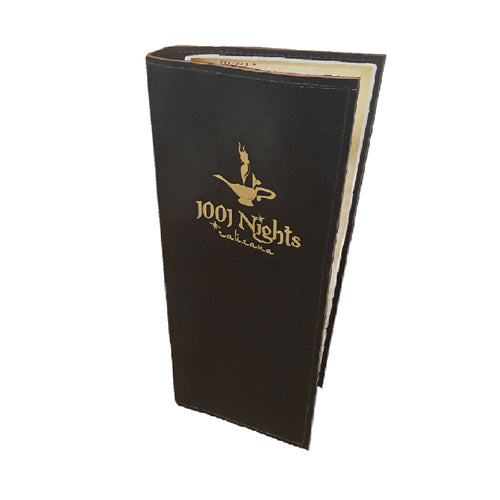 Menu Cover, holds 4-1/4" x 11" inserts, single panel with 1 view, flush cut stitched edge, genuine leather, with hot foil stamped/debossed logo on front cover (includes all plate, stamp and set-up charges)