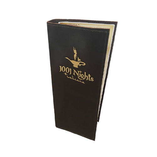 Menu Cover, holds 4-1/4" x 14" inserts, single panel with 1 view, flush cut stitched edge, genuine leather, with hot foil stamped/debossed logo on front cover (includes all plate, stamp and set-up charges)