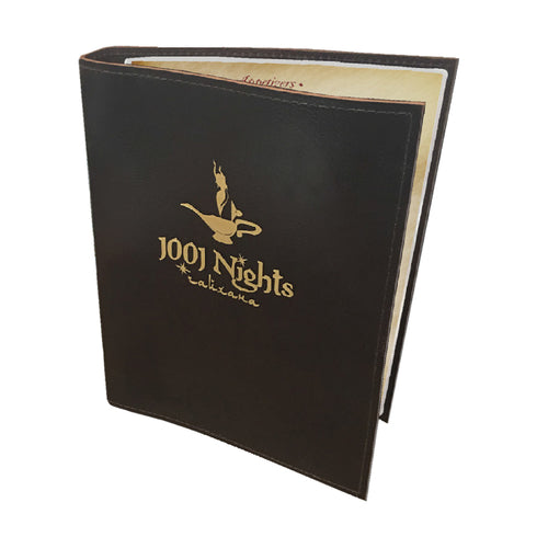Menu Cover, holds 8-1/2" x 11" inserts, single panel with 1 view, flush cut stitched edge, genuine leather, with hot foil stamped/debossed logo on front cover (includes all plate, stamp and set-up charges)