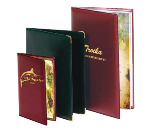 Menu Cover, holds 8-1/2" x 11" insert, single panel with 1 view, leather-like material, foam padding, interior clear pockets, heat sealed and stitched edges, includes logo (up to 45 sq. inches, includes all plate, stamp, deboss, and set-up charges), Hampton (price per ea, minimum order 25)