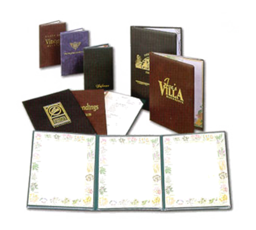 Menu Cover, holds 5-1/2" x 11" inserts, double panel with 2 views, expanded two-tone vinyl electronically sealed to inside leatherette vinyl lining, (2) clear welded pockets to inside lining, hot foil stamped/debossed on front (includes all plate, stamp, deboss and set-up charges) Harrisburg (priced per each, minimum order 25)