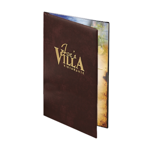 Menu Cover, holds 8-1/2" x 14" inserts, double panel with 2 views, expanded two-tone vinyl electronically sealed to inside leatherette vinyl lining, (2) clear welded pockets to inside lining, hot foil stamped/debossed on front (includes all plate, stamp, deboss and set-up charges) Harrisburg (priced per each, minimum order 25)