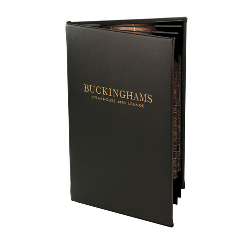 Menu Cover, holds 5-1/2" x 11" inserts, quad panel booklet with 6 views, metal-look material front, turned edge finish, no stitching, hot foiled stamped/debossed logo on front cover (up to 45 sq. inches, includes all plate, die, stamp, and set-up charges) Majestic (priced per each, minimum order 25)