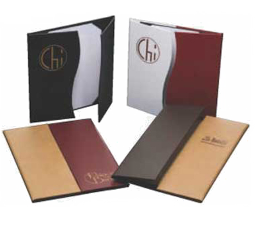 Menu Cover, holds 4-1/4" x 8-1/2" x 4-1/4" x 14" sheet size, S-curve inserts, gatefold design, includes cover logo hot foil stamped in one color, (priced per each, minimum order 25 each)