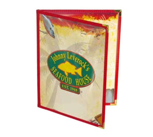 Menu Jacket, holds 4-1/4" x 11" inserts, double panel with 4 views, cafe style, clear sewn edge, crystal clear vinyl, double row of stitching for binding, tucked under edges, crimped metal corners, Quick Ship (normally ships within 5 to 10 business days) (priced per each, minimum order 25 each)