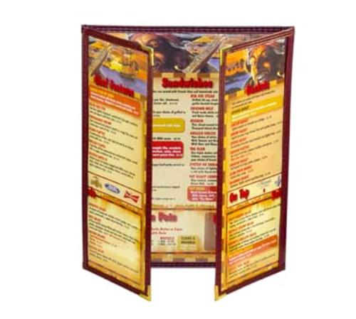 Menu Jacket, holds 4-1/4", 8-1/2", 4-1/4 x 14" inserts, triple pocket gatefold with 6 views, cafe style, clear sewn edge, crystal clear vinyl, double row of stitching for binding, tucked under edges, crimped metal corners, (priced per each/minimum 25 each) Quick Ship (normally ships within 5 to 10 business days) (priced per each, minimum order 25 each)