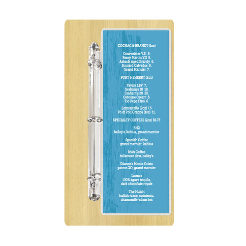 Menu Board, holds 4-1/4" x 11" inserts, single panel, nickel three ring mechanism with 1/2" capacity, wood frame (priced per each, minimum order 25)