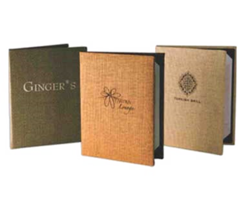 Menu Cover, holds 5-1/2" x 8-1/2" insert, single panel with 1 view, deeply, textured vinyl with Wicker look, includes logo on standard size window (up to 45 sq. inches, includes all plate, die stamp, and set-up charges), Western Flower (priced per each, minimum order 25)