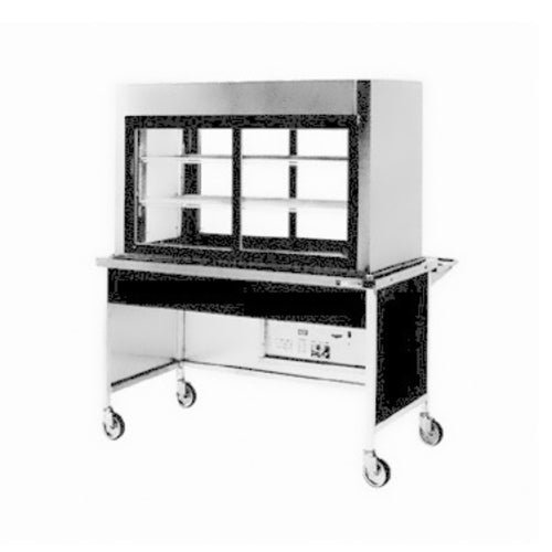 Cold Food Pass-Thru Display Counter, 50"L, self-contained refrigeration, sliding glass doors, (2) adjustable shelves, stainless steel top, aluminum square tubing frame, laminated front panel, 5" swivel casters, (2) with brakes