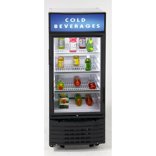 Commercial Beverage Cooler, reach-in, one-section, 22"W, 6.0 cu. ft. capacity, self-contained bottom mount refrigeration, hinged glass door with lock, (3) adjustable shelves, LED interior light, digital display, clear plexi insert for graphics, rollers, R600a refrigerant, 120v/60/1-ph, 2.5 amps, cord & plug, cETLus