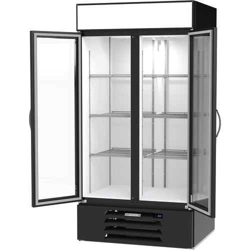 MarketMax™ Refrigerated Merchandiser, reach-in, two-section, 39-1/2"W, 78-1/8"H, (2) double pane hinged glass doors, 36.87 cu. ft. capacity, electronic control, digital display, (6) epoxy coated steel shelves, LED interior lighting, self closing door with automatic hold-open feature, bottom-mounted refrigeration, white interior, black exterior, R290 Hydrocarbon refrigerant, 1/4 HP, cULus, UL EPH Classified, UL-Sanitation, Made in USA