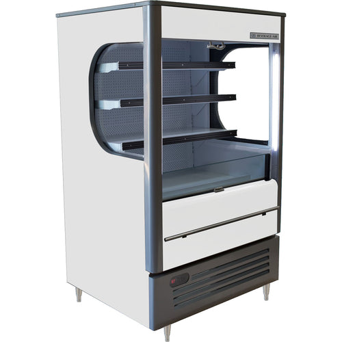 Vuemax Series Open-Air Merchandiser, 35-1/2"W x 31-3/4"D x 63-7/8" H, 8 cu. ft. capacity, tempered thermal glass sides, (3) shelves, price tag molding, night curtain, 36° F - 40° F operating temperatures, LED interior lighting, maintenance-free condenser, automatic defrost, R290 Hydrocarbon refrigerant, painted steel interior, white vinyl wrapped exterior, 1/3 HP, cETLus, ETL-Sanitation