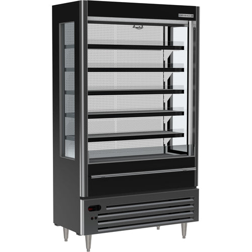 Vuemax Series Slim Open-Air Merchandiser, 47-7/16"W x 24-3/8"D x 83-1/2" H, 12.7 cu. ft. capacity, tempered thermal glass sides, (5) shelves, price tag molding, night curtain, 36° F - 40° F operating temperatures, LED interior lighting, maintenance-free condenser, automatic defrost, R290 Hydrocarbon refrigerant, painted steel interior, black vinyl wrapped exterior, (2) 1/3 HP, cETLus, ETL-Sanitation