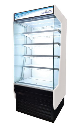 Open Display Case, 36-1/16"W, 19.5 cu. ft. capacity, bottom mount self-contained refrigeration, open front, glass side panels, (4) adjustable shelves, LED interior lighting, rear air guard, night curtain, pre-coated steel for the exterior, and non-peel durable powder-coated steel for the interior, 1 HP, 115v/60/1-ph, cord with NEMA 5-20P, cUL, UL, ETL-Sanitation