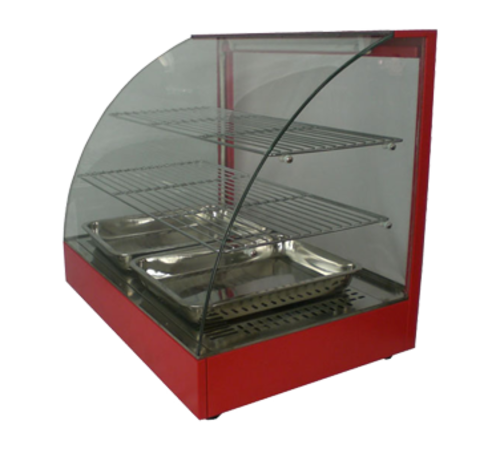 Food Warmer Merchandiser, counter top, full service, 26"W x 17-1/2"D x 22-3/4"H, curved front glass, adjustable thermostat, temperature up to 160°F, (2) chrome plated fixed shelves + deck, (2) piece sliding rear glass doors, stainless steel construction, 120v/60/1-ph, 1200 watts, ETL