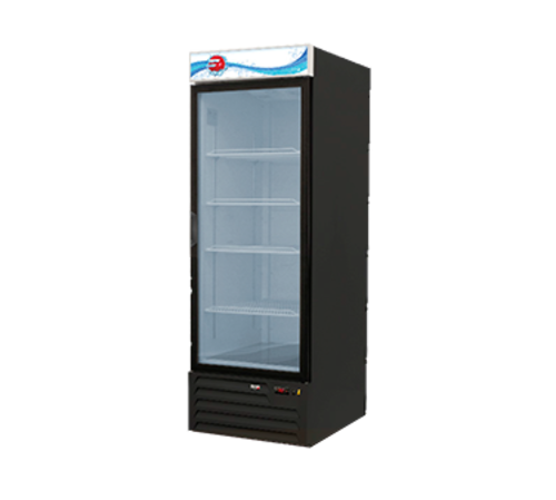 19086737 Freezer Merchandiser, one-section, 23 cu. ft., self-contained refrigeration, (1) hinged triple pane insulated glass door, (4) adjustable wire shelves, electronic temperature control, LED interior lighting, illuminated exterior sign panel, hi/low temperature alarms, automatic defrost, black vinyl exterior finish, white steel interior, bottom mounted slide out compressor, 3/4 HP, cETLus, ETL-Sanitation, UL, NSF, cETLus, ETL-Sanitation, Made in North America