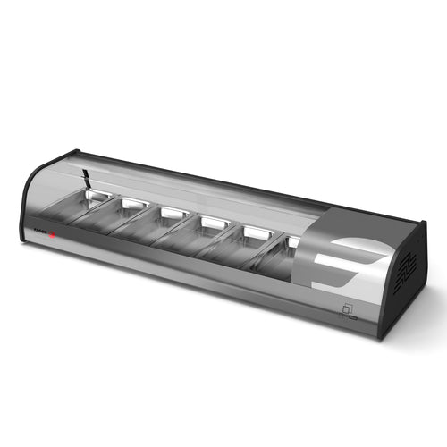 19055407 Refrigerated Countertop Display/Tapas Case, 54-7/8" long, (6) 1/3 GN pan capacity (1.5" deep), front curved glass, (2) service side glass sliding doors, LED light, right side mounted compressor, stainless steel construction, 1/6 hp, cETL, UL, NSF 7, Made in North America