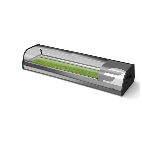 19055402 Refrigerated Countertop Display/Sushi Case, 54-7/8" long, front curved glass, (2) service side glass sliding doors, LED lighting Refrigeration coils on both top & bottom of products, right side mounted compressor, stainless steel construction, plastic sides, 1/6 hp, NSF, Made in North America