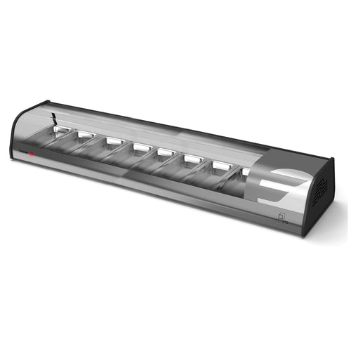 19010340 Refrigerated Countertop Display/Tapas Case, 68-7/8" long, (8) 1/3 GN pan capacity (1.5" deep), front curved glass, (2) service side glass sliding doors, LED light, right side mounted compressor, stainless steel construction, 1/6 hp, cETL, UL, NSF 7, Made in North America