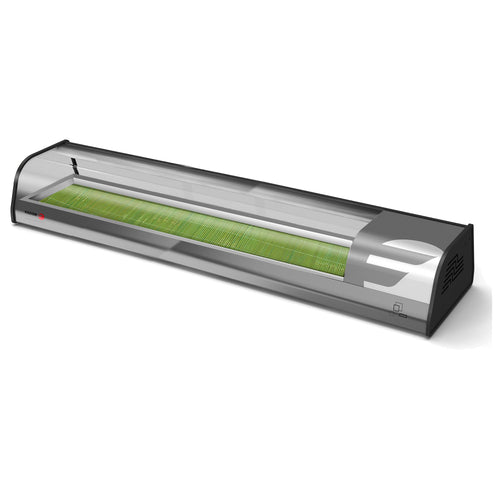 19055405 Refrigerated Countertop Display/Sushi Case, 68-7/8" long, front curved glass, (2) service side glass sliding doors, LED lighting, Refrigeration coils on both top & bottom of products, right side mounted compressor, stainless steel construction, plastic sides, 1/6 hp, NSF, Made in North America
