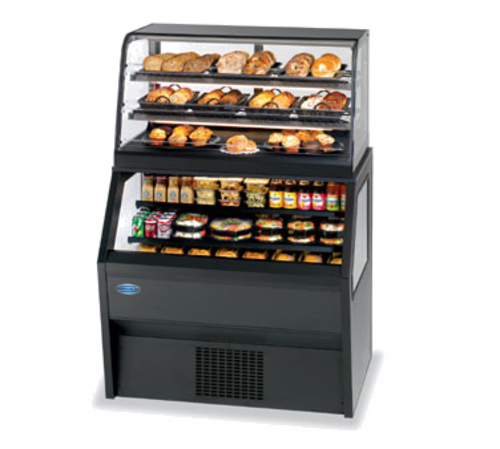 Specialty Display Hybrid Merchandiser Refrigerated Self-Serve Bottom With Non-Refrigerated Self-Service Top, 36.25"W x 39"D x 69.75”H, refrigerated self-serve bottom: black laminated exterior with black trim, horizontal 3500K LED top & front light, (2) tiers of black metal shelves with black interior, tempered glass ends, Non-Refrigerated Self-Service Top: (3) hinged lift-up front doors, black trim, (2) tier black wire shelves, sliding rear doors, 1/3 HP, cULus, UL EPH Classified, Made In USA, DOE 2017 compliant