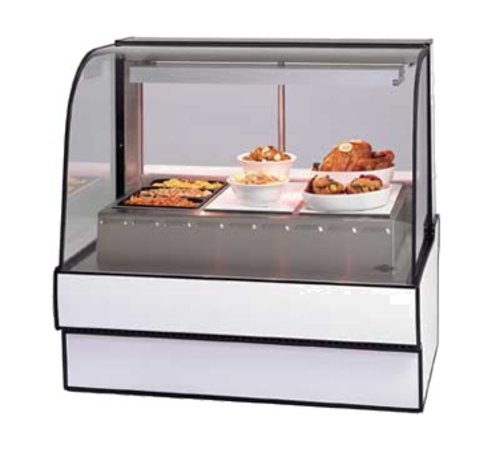Curved Glass Hot Deli Case, 59.13"W x 35.31D x 48”H, wet or dry heat, (3) wells, independently controlled stainless steel heating wells each with a calrod heating element, top-mounted full-length infrared heater, curved thermopane tilt-front glass, forced air front-glass defogger, LED top light, glass sliding rear doors with moisture vents, stainless steel deck, tempered glass ends, removable wrapping board, designed for continuous lineups, choice of laminate, black trim, drain not needed, UL, UL EPH CLASSIFIED
