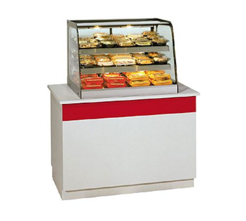Counter Top Hot Merchandiser, 24"W x 29.7"D x 25.1”H, tempered curved front glass, top light & lighted shelves, (2) tiers of adjustable stainless steel heated shelves, humidified air system, stainless steel display deck, stainless steel construction with black trim, removable sliding glass rear doors, tempered glass end panels, set directly on counter, cord & plug, cULus, UL EPH Classified, Made In USA