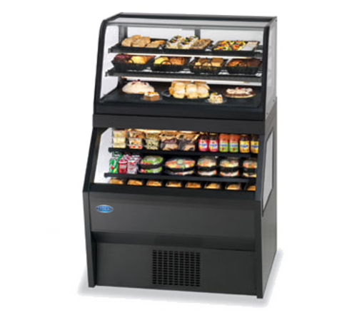 Specialty Display Hybrid Merchandiser Refrigerated Self-Serve Bottom With Refrigerated Service Top, 36.25"W x 43.25"D x 72.5”H, refrigerated self-serve bottom: black laminated exterior with black trim, horizontal 3500K LED top & front light, (2) tiers of black metal shelves with black interior, tempered glass ends, refrigerated top: glass with black trim, (2) tier black wire shelves, sliding rear doors, cULus, UL EPH Classified, Made In USA