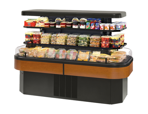 Specialty Display Island Self-Serve Refrigerated Merchandiser, 84"W x 40"D x 55”H, self contained refrigeration, condensate pump, adjustable temperature control, 3500K LED top & undershelf lighting, (2) tiers of adjustable black metal shelves, curved air deflector, black metal base, black interior & canopy, choice of laminate, 1-1/2 HP, cULus, UL EPH Classified, Made In USA, DOE 2017 compliant