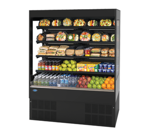 Refrigerated Self-Serve Slim-Line High Profile Specialty Merchandiser, 47-1/4" x 24"D x 78"H, adjustable black metal shelves with price tag molding, (4) tier of shelves can be flat or slanted, top mounted LED light, choice of six standard laminates exterior, stainless steel display deck, black interior & glass end panels, front air Intake & discharge, night curtain, electronic temperature control with on-demand defrost, cord & plug, cULus, UL EPH Classified, Made In USA, DOE 2017 compliant