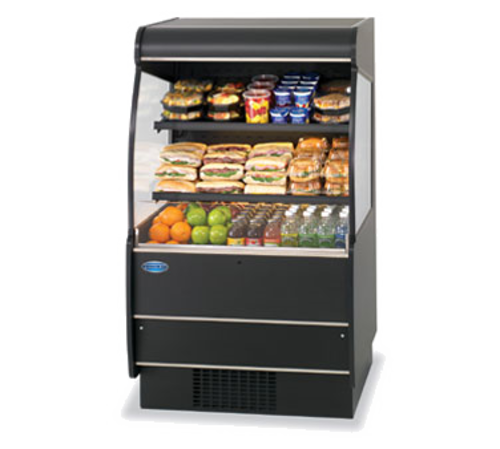 Specialty Display High Profile Self-Serve Refrigerated Merchandiser, 59-1/4"W x 35-1/4D x 60-1/4"H, self contained refrigeration, energy saving night curtain, 3500K LED top light, (2) tiers of adjustable black metal shelves, stainless steel display deck, black interior, tempered glass ends, choice of laminate, designed for continuous lineups, cULus, UL EPH Classified, Made In USA, DOE 2017 compliant