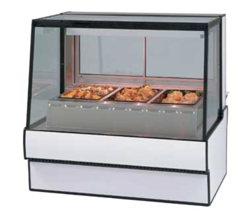 High Volume Hot Deli Case, 59-1/8"W x 35-5/16"D x 48”H, wet or dry heat, (3) wells, independently controlled stainless steel heating wells each with a calrod heating element, top-mounted full-length infrared heater, sloped thermopane tilt-front glass, forced air front-glass defogger, LED top light, glass sliding rear doors with moisture vents, stainless steel deck, tempered glass ends, removable wrapping board, designed for continuous lineups, choice of laminate, black trim, drain not needed, cULus, UL EPH Classified, Made In USA